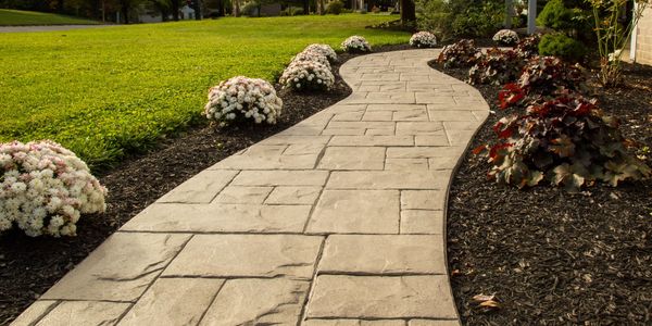 a walkway that has been textured, colored, and patterned to resemble more expensive materials like natural stone, brick, or wood. The imprinting is done by pressing large polyurethane or plastic stamps into freshly poured concrete.